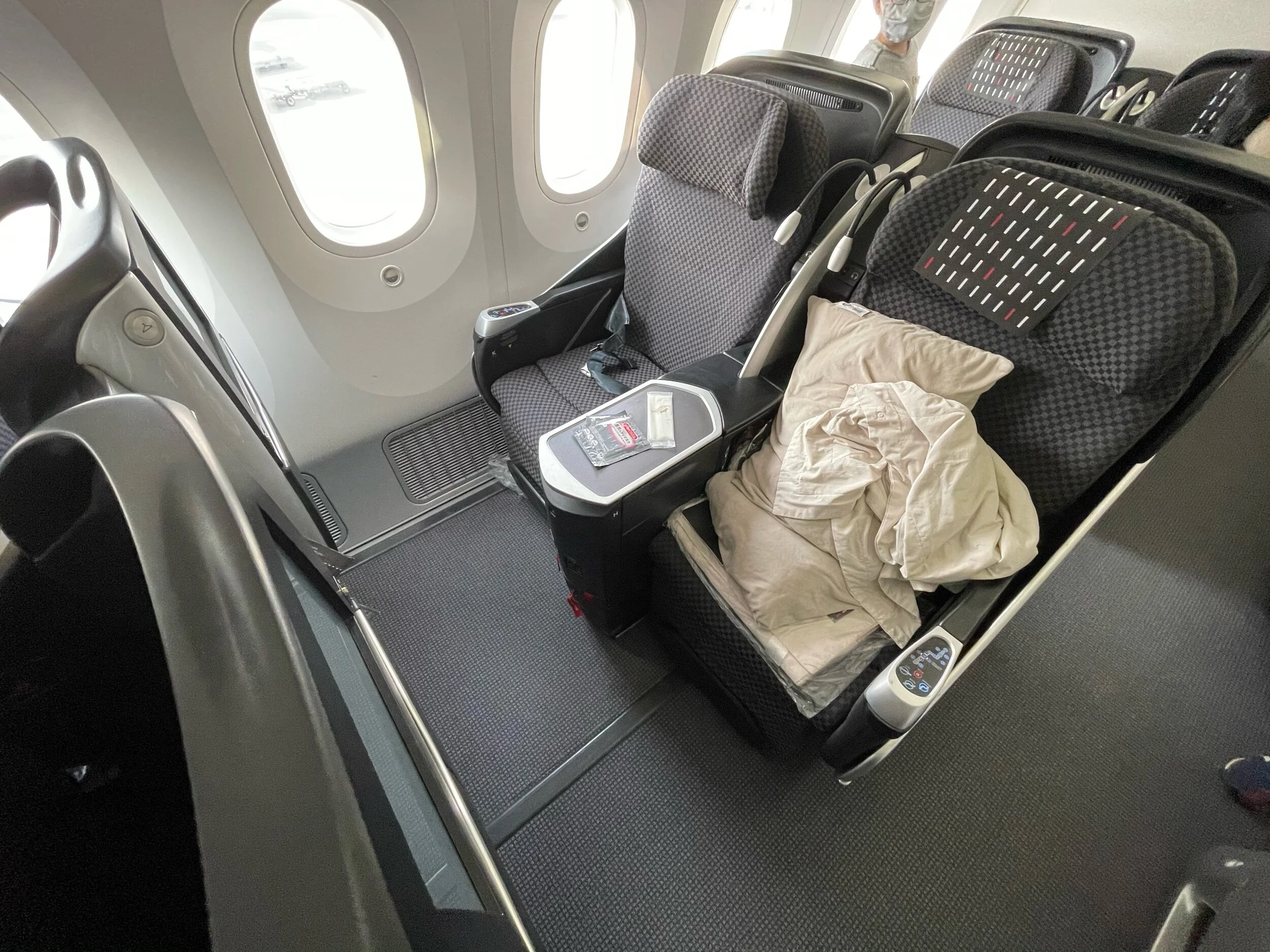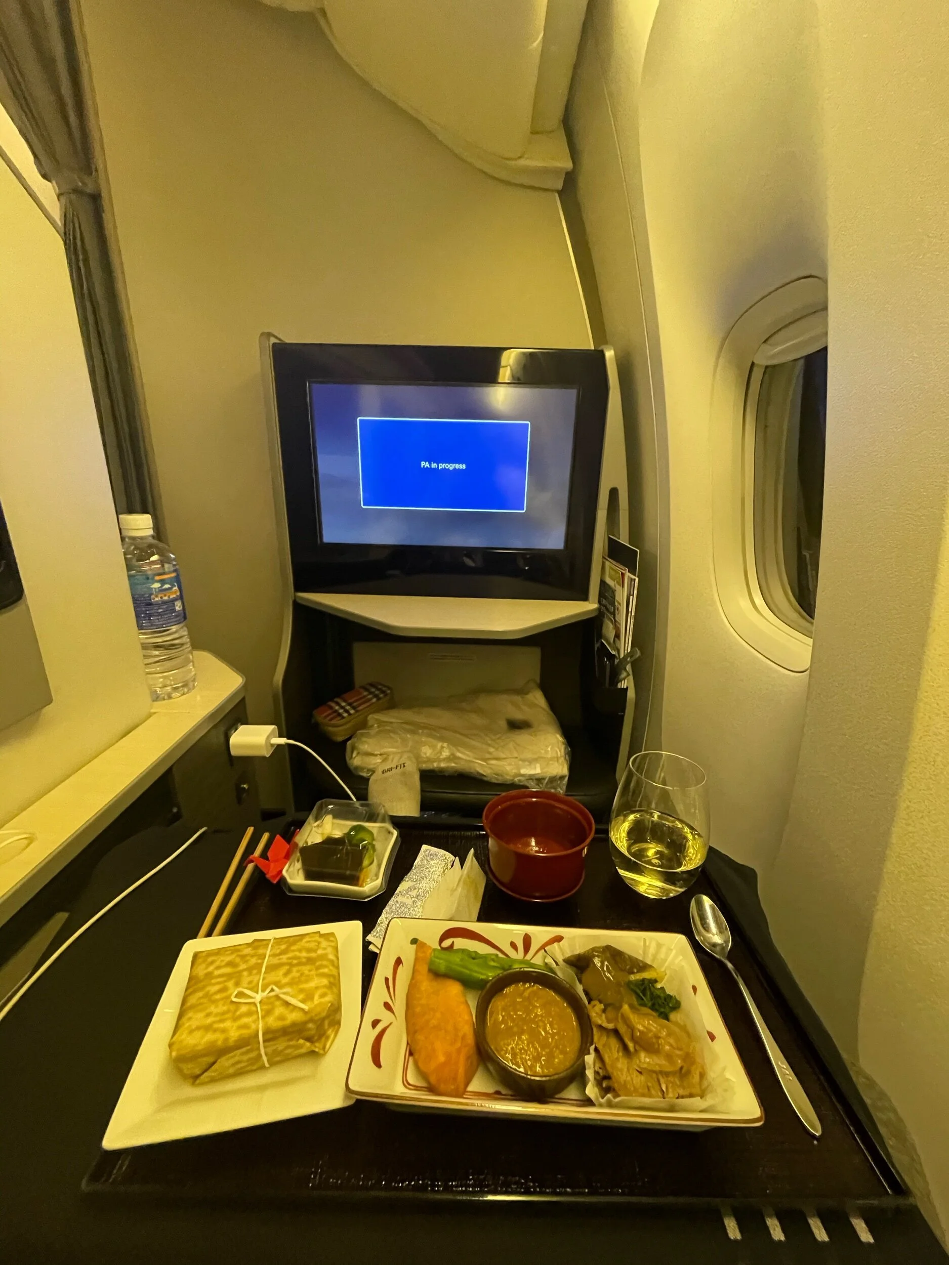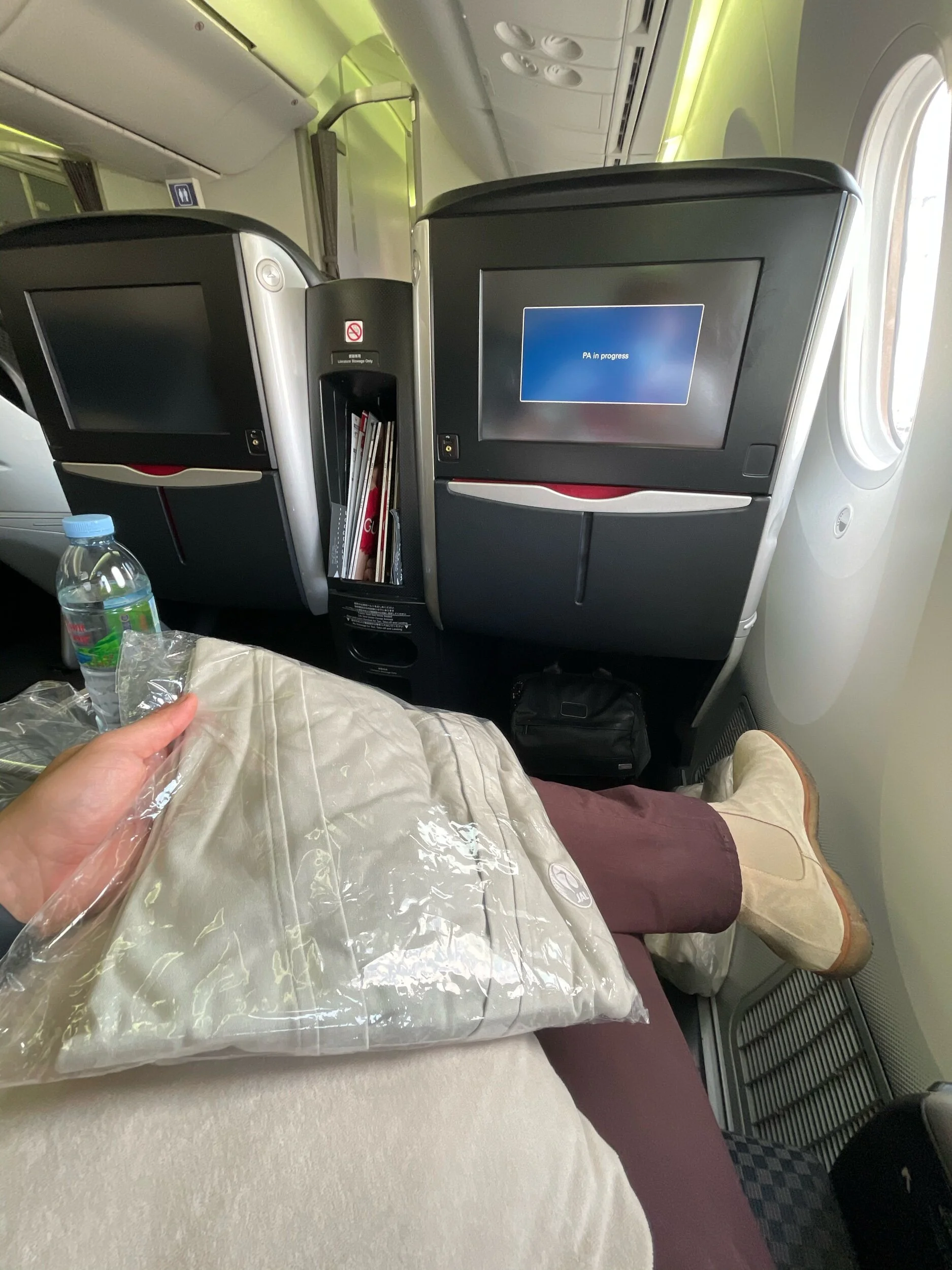 Look, it won’t compare to any current business class seat like those you’ll find on Cathay Pacific, Qatar, Emirates or even China Eastern, but, for a lie-flat (not fully flat), shell seat, I thought it was pretty comfortable. You have ample leg room and sufficient storage space. Plus, no one was sitting next to me in this 2x2x2 layout cabin, which was a huge plus - having to climb over someone asleep from the window seat is not ideal. I was able to get a couple hours of sleep on this flight, which was just what I needed. So while the seat is definitely not in the same tier of 1x2x1 business class seats, I found it more spacious and comfortable than what you’d find on United’s old 787 Polaris business class or Air France’s old 777-200 business class.